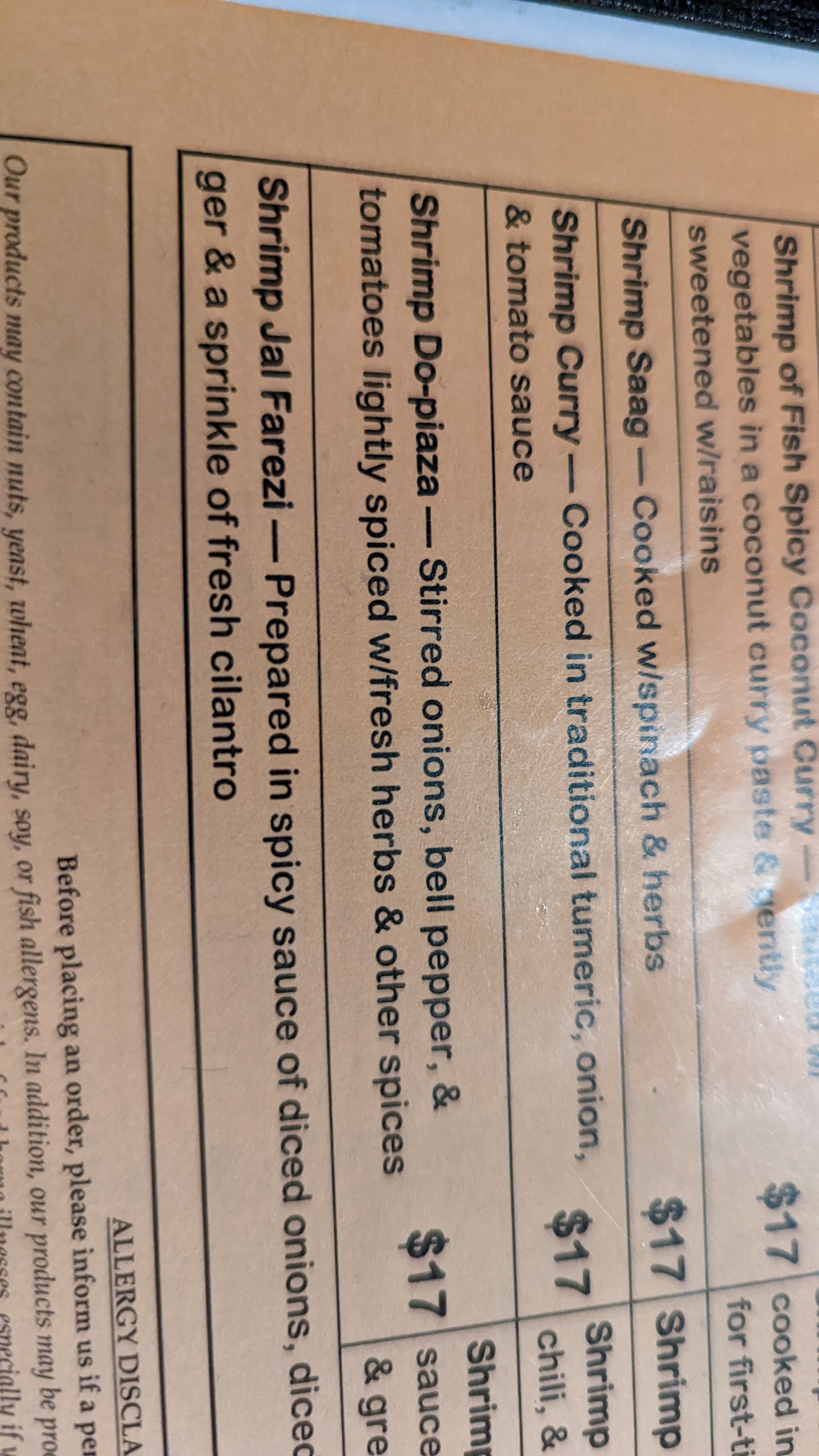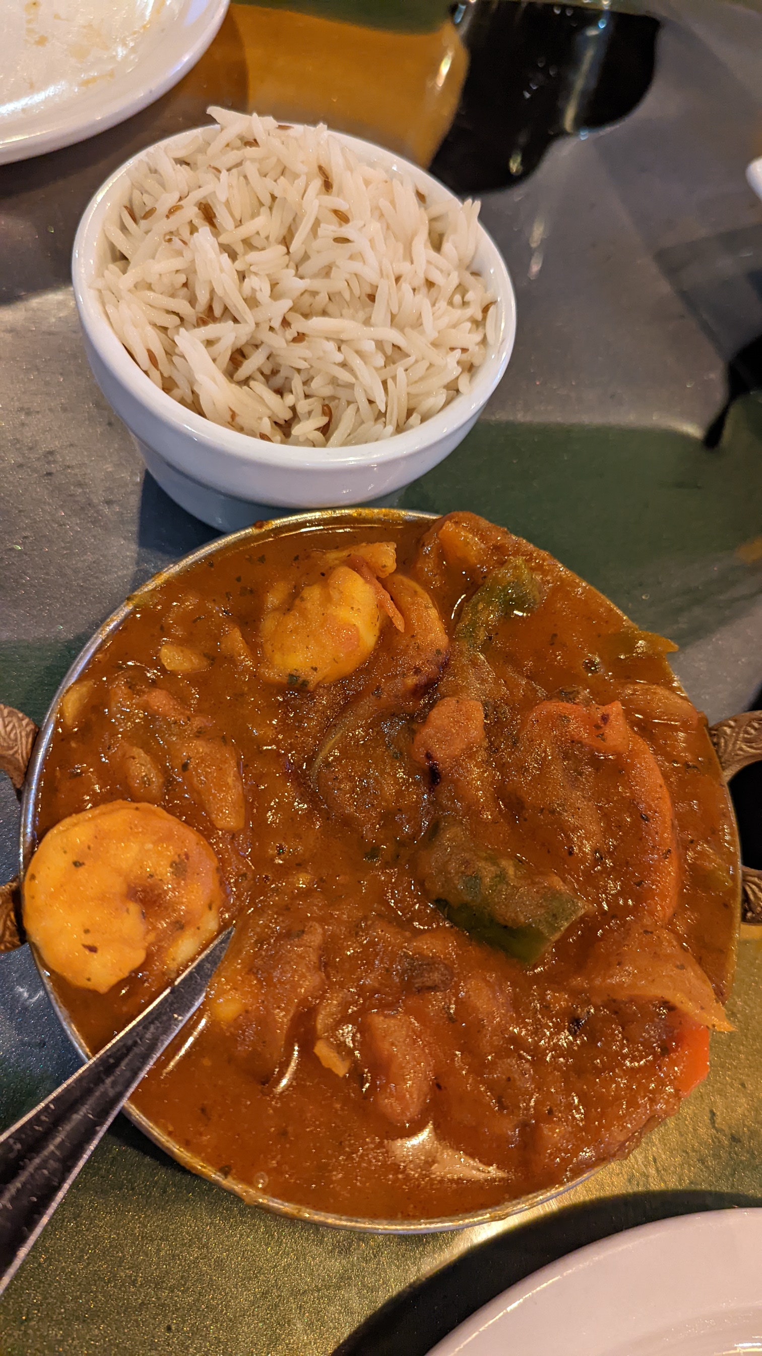 For the main course they split an order of Shrimp Do-Pieza. The shrimp were tender, the peppers and onions shown through, and the spices were flavorful with just a touch of heat at the end. So good.